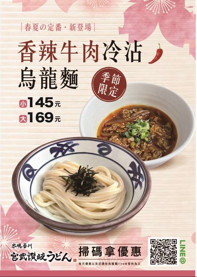 『香辣牛肉冷沾烏龍麵』 活動日期 : 3/1 - 6/30 ( 平日限定 ) 活動內容 : 手工製作烏龍麵製程冷沾麵搭配嚴選牛肉片 涮一涮宮武秘製的香辣醬汁,並漱一口透心涼的冷沾麵 啊 ~ 像極了春天的感覺 ~ 適用店鋪 : 宮武讃岐烏龍麵全分店