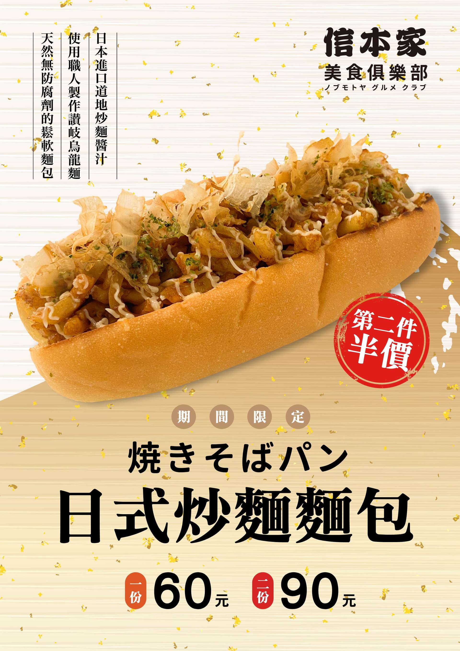 『日式炒麵麵包上市了!』 活動日期 : 5/3 起 活動內容 : 一份 60 元!第二件半價! 兩份只要90元 ! 新品上市!多層次的完美風味 等你來試試! 適用店鋪 : 信本家西門店、信本家光復店、信本家健行店