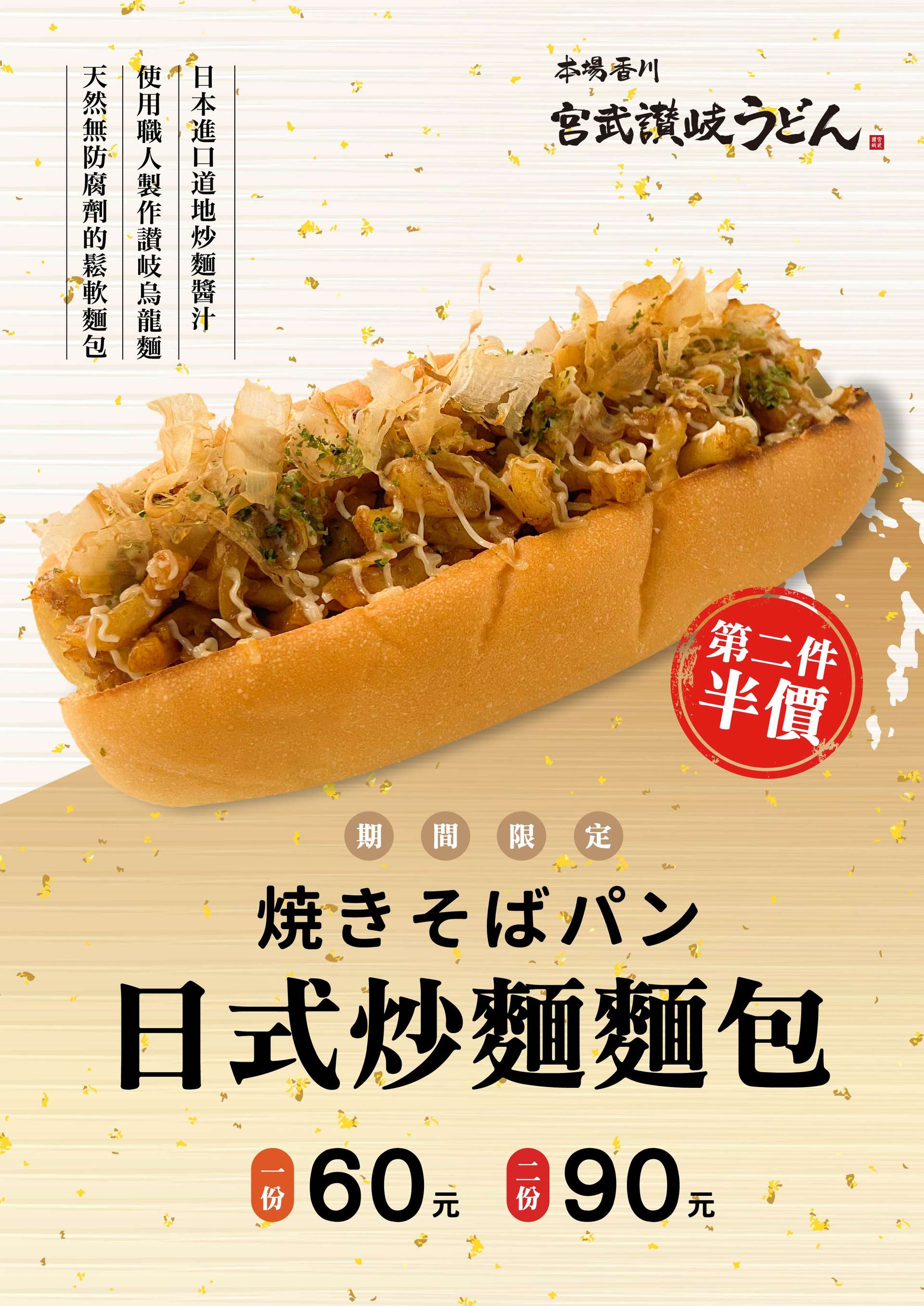 『日式炒麵麵包上市了!』 活動日期 : 5/3 起 活動內容 : 一份 60 元!第二件半價! 兩份只要90元 ! 新品上市!多層次的完美風味 等你來試試! 適用店鋪 : 宮武讃岐烏龍麵南西店