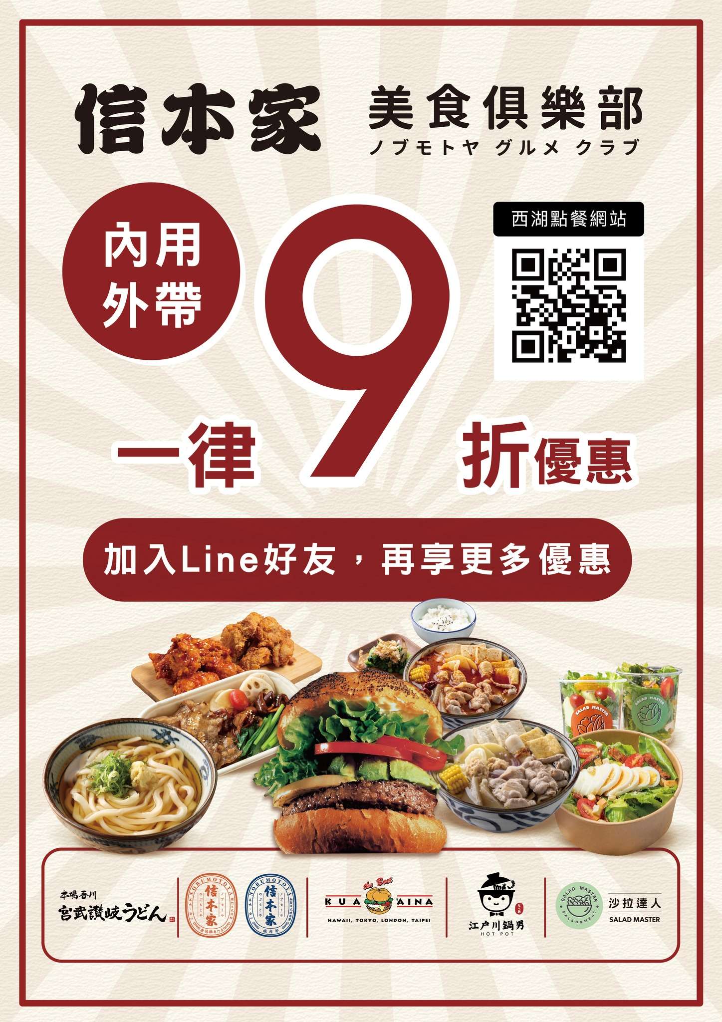 『信本家 內用外帶優惠活動』 活動日期 : 4/15起 活動內容 : 到信本家美食外送廚房,現場消費內用或外帶先享 9 折優惠 ! 使用優惠券,結帳金額滿 200 元再折 20 元。 適用店鋪 : 信本家西門店、信本家光復店、信本家西湖店、信本家健行店