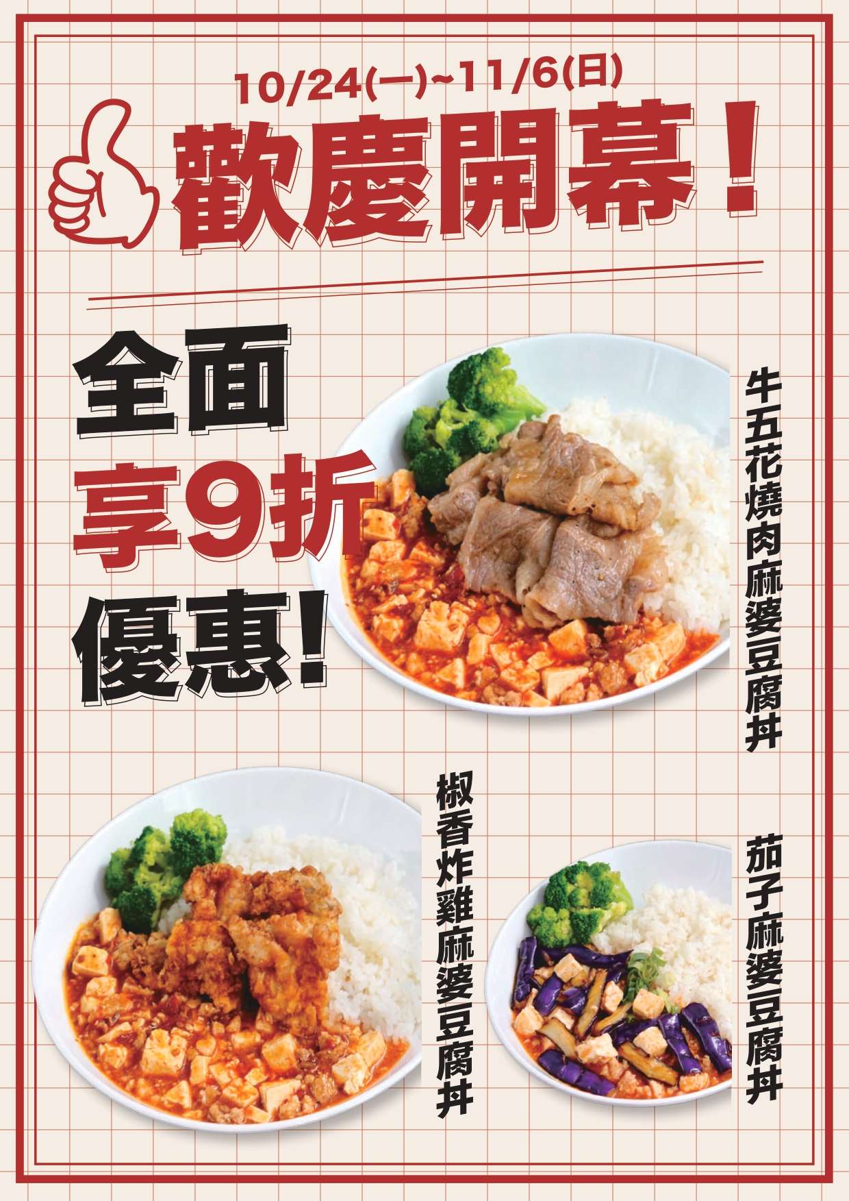 『Mrs.Mapo麻婆豆腐 開幕慶』 活動日期 : 10/24 - 11/6 活動內容 : Mrs.Mapo 全面餐點享 9 折優惠! <活動依店鋪公告為主> 適用店鋪 : Mrs.Mapo 麻婆豆腐 家樂福新店店