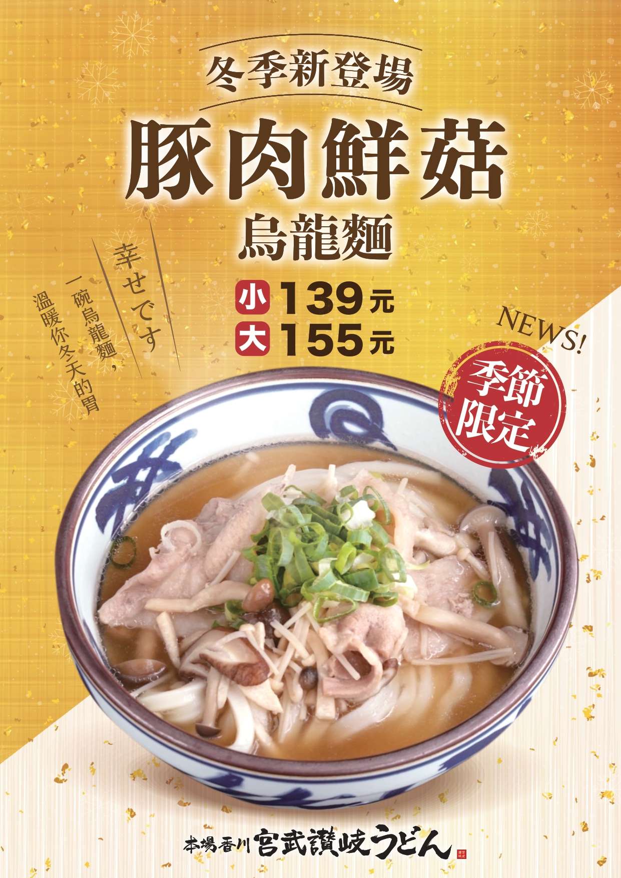 『豚肉鮮菇烏龍麵』 活動日期 : 2022/12/1 - 2023/2/28 活動內容 : 冬季限定~豚肉鮮菇烏龍麵上市了 讓一碗烏龍麵溫暖你冬天的胃! 適用店鋪 : 宮武讃岐烏龍麵全分店