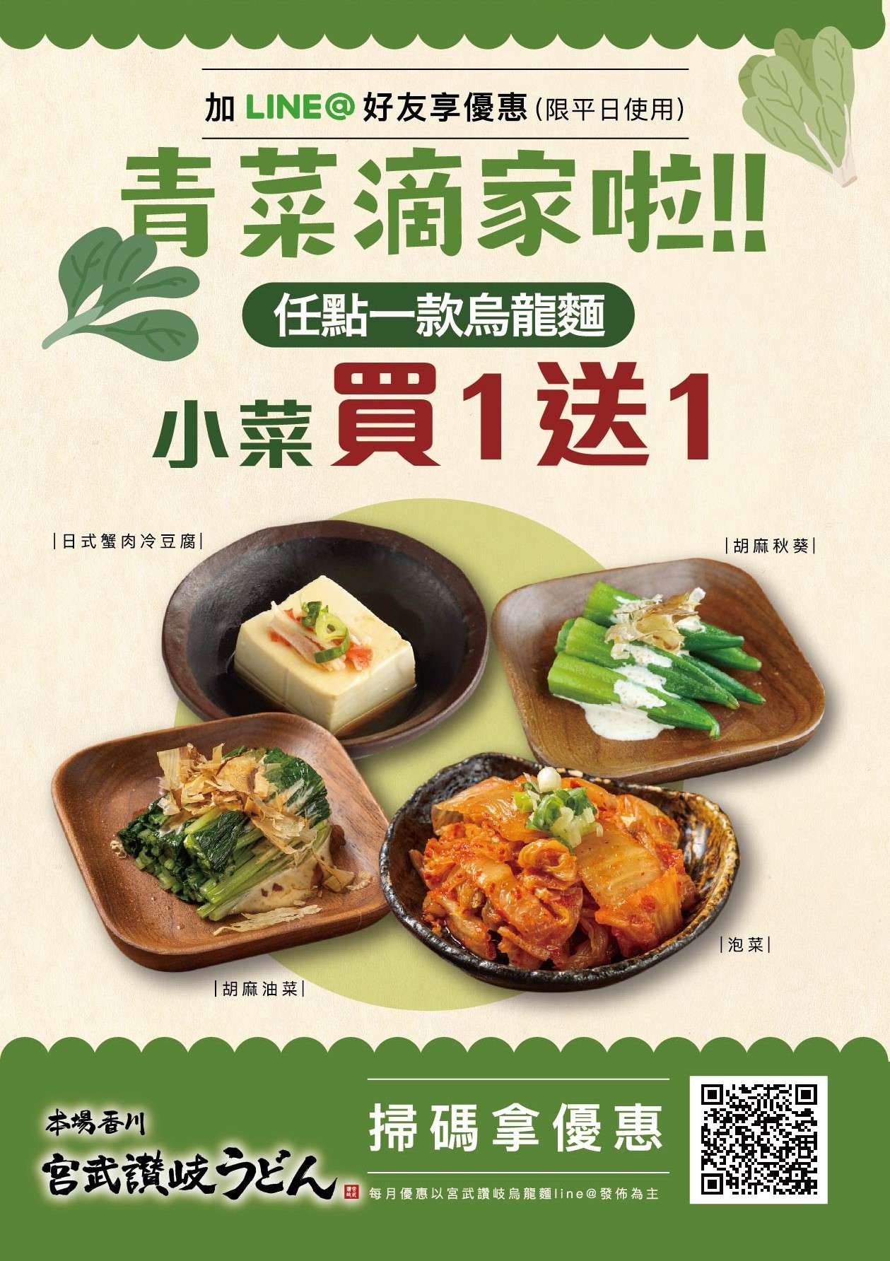 『加入 Line 好友 3 月活動』 活動日期 : 3/1 - 3/31 ( 平日限定 ) 活動內容 : 出示 Line 優惠券,任點一碗烏龍麵,小菜買一送一。
