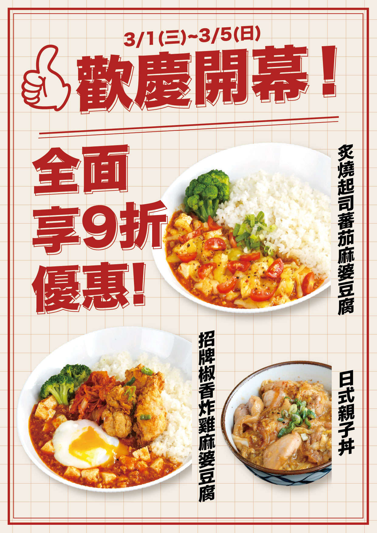 『Mrs.Mapo麻婆豆腐 開幕慶』 活動日期 : 3/1 - 3/5 活動內容 : Mrs.Mapo 全面餐點享 9 折優惠! <活動依店鋪公告為主> 適用店鋪 : Mrs.Mapo麻婆豆腐 新竹巨城店