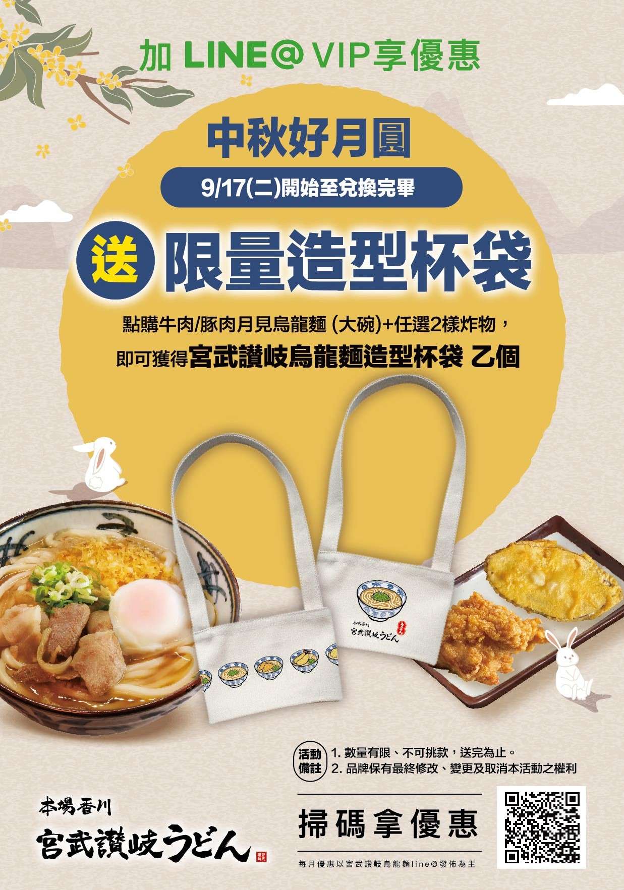 『中秋來宮武賞月,送限量造型杯袋』 活動日期 :9/17 (二) 至贈完為止 活動內容 :凡點購 豚肉/牛肉月見烏龍麵(大碗) + 任選2樣炸物,即贈送限量造型杯套乙個 適用店鋪 : 適用於全宮武品牌全系列分店
