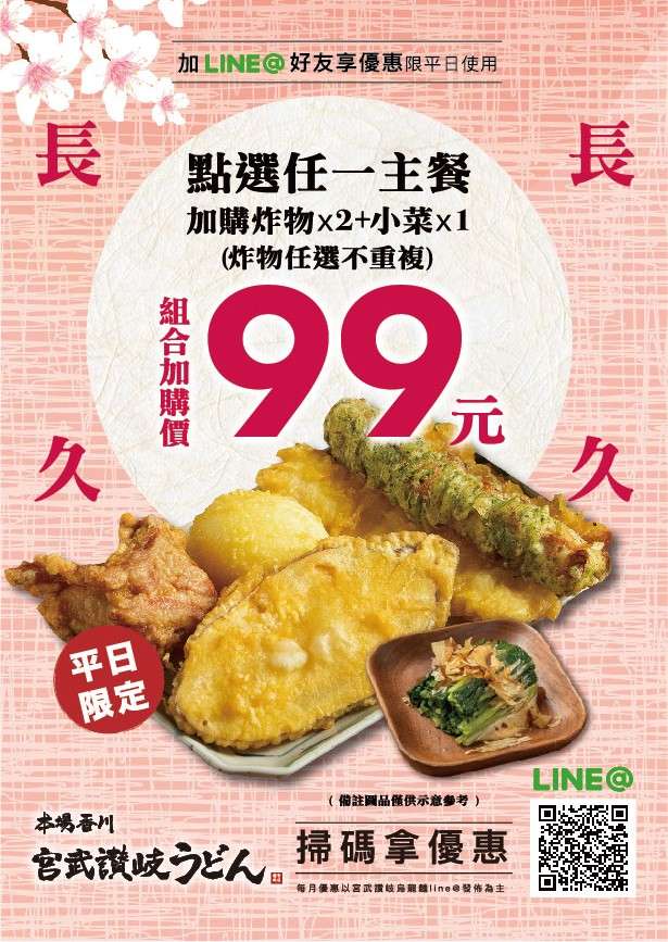 『加入 Line 好友 9月活動』 活動日期 :9/2~9/30 ( 平日限定 ) 活動內容 :點購任一主餐,加購2樣炸物及1樣小菜,優惠價$99! ***Express店不適用 適用店鋪 : 宮武林口店、宮武樹林店、宮武文心店、宮武台中港店、宮武西門店、宮武台南店。