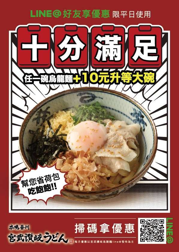 『加入 Line 好友 10月活動』 活動日期 :10/1~10/31 ( 平日限定 ) 活動內容 :點只要點任一款小碗烏龍麵,加 10 元,升級成大碗份量 ***Express店不適用 適用店鋪 : 宮武林口店、宮武樹林店、宮武文心店、宮武台中港店、宮武西門店、宮武台南店。