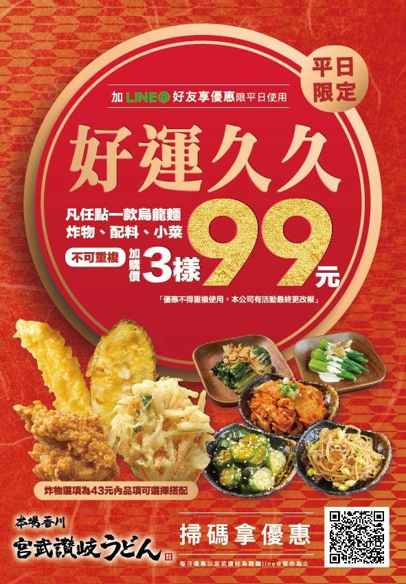 『加入 Line 好友2月活動』 活動日期 : 2/3 - 2/27 ( 平日限定 ) 活動內容 : 點購任一主餐,加購炸物、配料、小菜三樣只要99元!! (不可重複) ***Express店不適用 適用店鋪 : 宮武林口店、宮武樹林店、宮武文心店、宮武台中港店、宮武台南店。