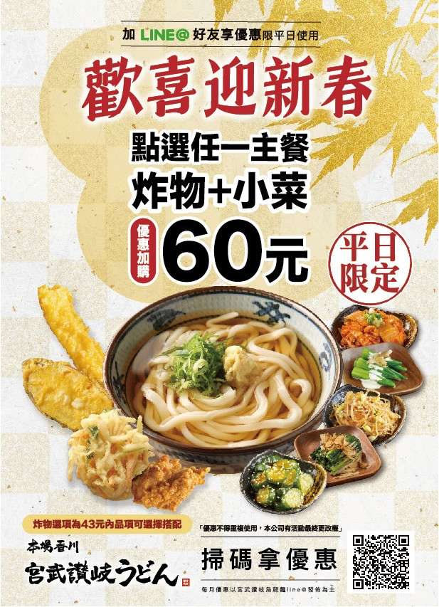 『加入 Line 好友3月活動』 活動日期 : 3/3 - 3/31(平日限定) 活動內容 : 點任一主餐,就能用60元加購炸物+小菜 ***Express店不適用 適用店鋪 : 宮武林口店、宮武樹林店、宮武文心店、宮武台中港店、宮武台南店。