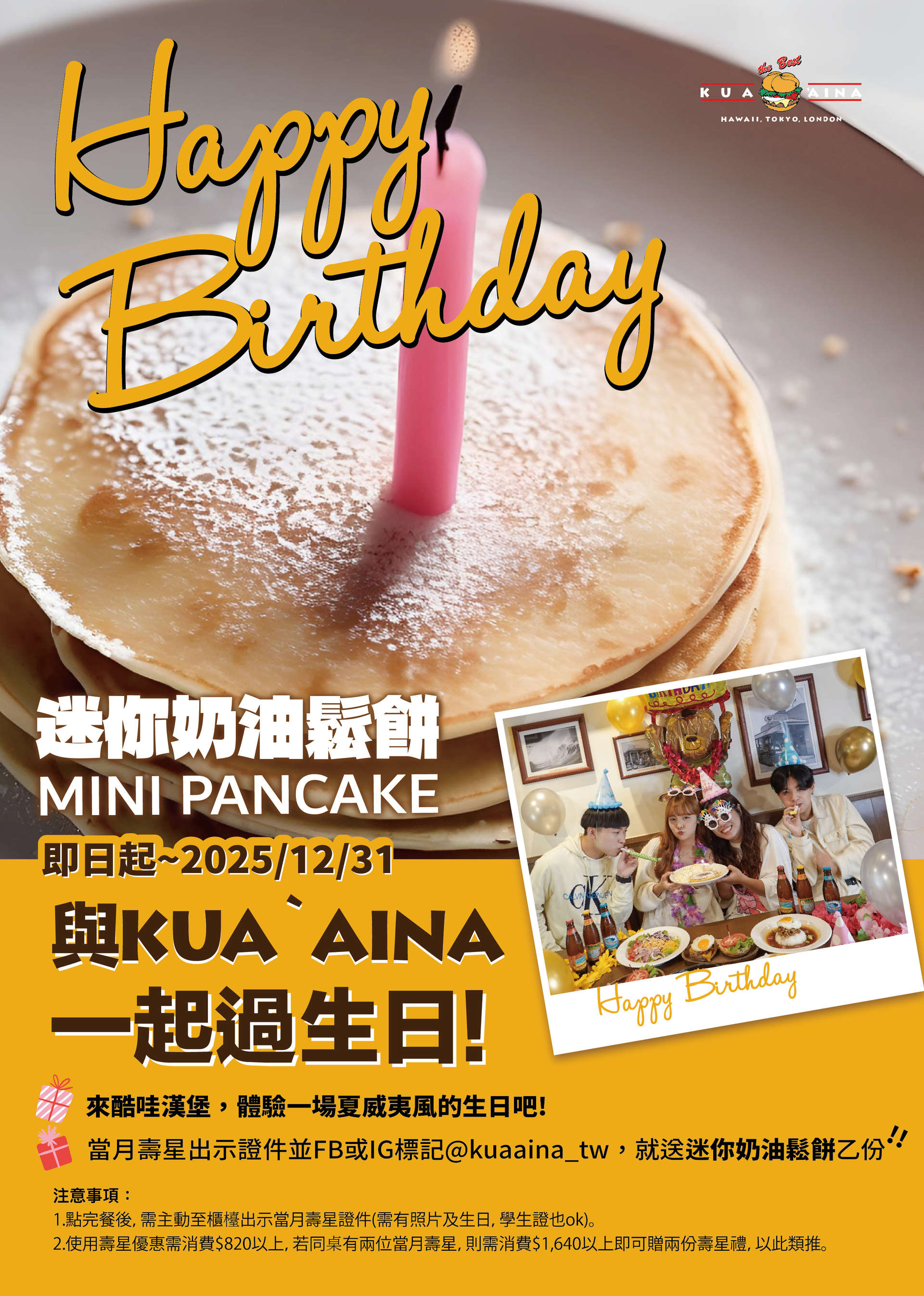 『KUA`AINA 生日活動』 時間:即日起至2025/12/31 當月壽星,消費滿$820元、打卡標記 @kuaauna_tw並出示證件,就送壽星專屬迷你小鬆餅 ! ●限內用 ●活動不得與其他優惠併用 ●信本飲食保有優惠最終解釋權利 適用店鋪 : KUA林口店、KUA台中港店