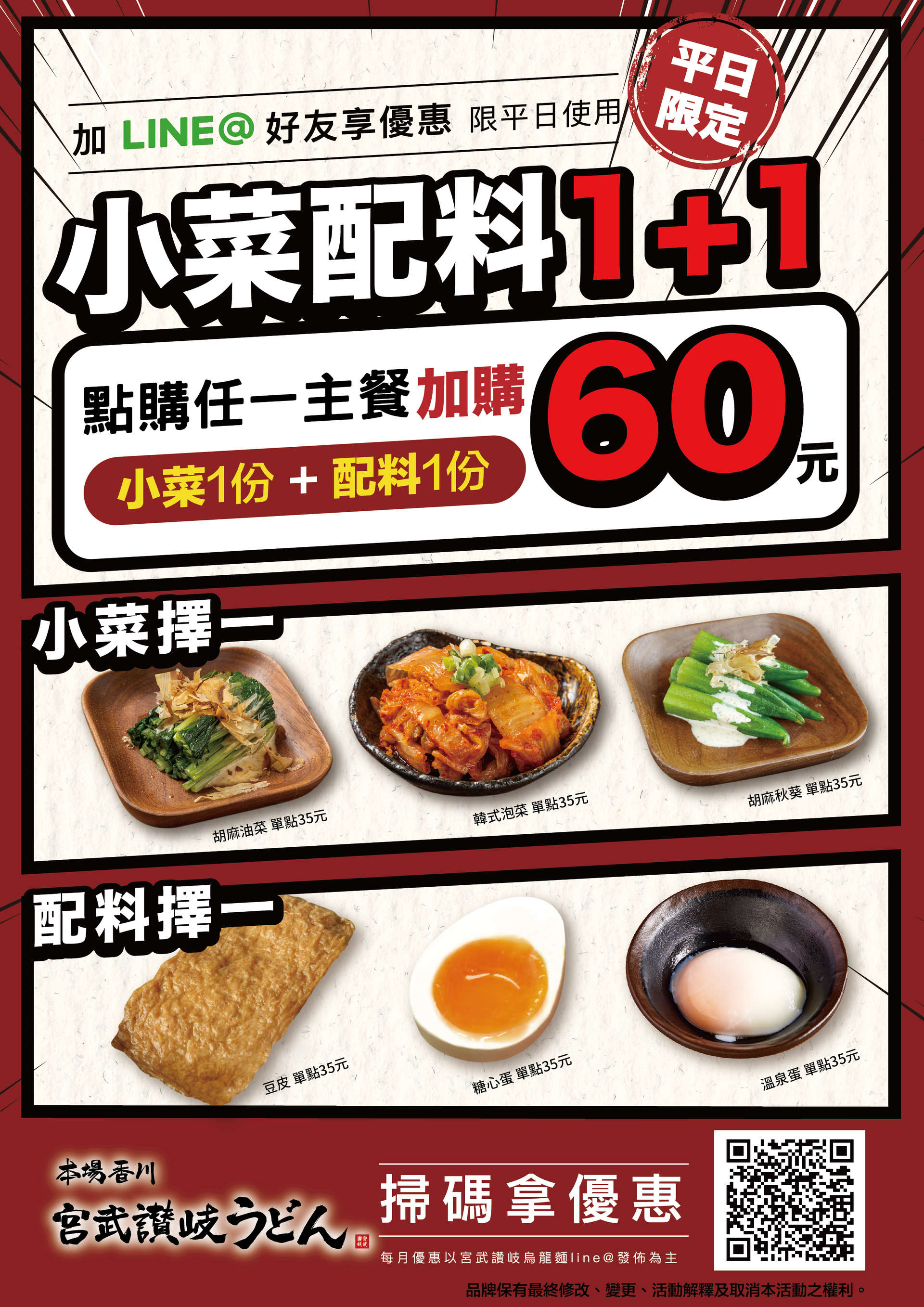 『加入 Line 好友7~8月活動』 活動日期 : 7/1 - 8/31(平日限定) 活動內容 : 點購任一主餐,小菜+配料只要60元! ***Express店不適用 適用店鋪 : 宮武林口店、宮武樹林店、宮武文心店、宮武台中港店、宮武台南店。